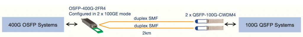 Breakout to Slower Speeds: As explained with the OSFP-400G-2FR4, some modules support breakout capabilities. For example, an OSFP-400G-2FR4 module can be used to split a 400G port into two 200G ports. By configuring the switch port for slower electrical signaling (e.g., 8x 25 Gb/s NRZ), it is even possible to connect two separate 100G QSFP transceivers, protecting the investment in existing hardware and facilitating migration.