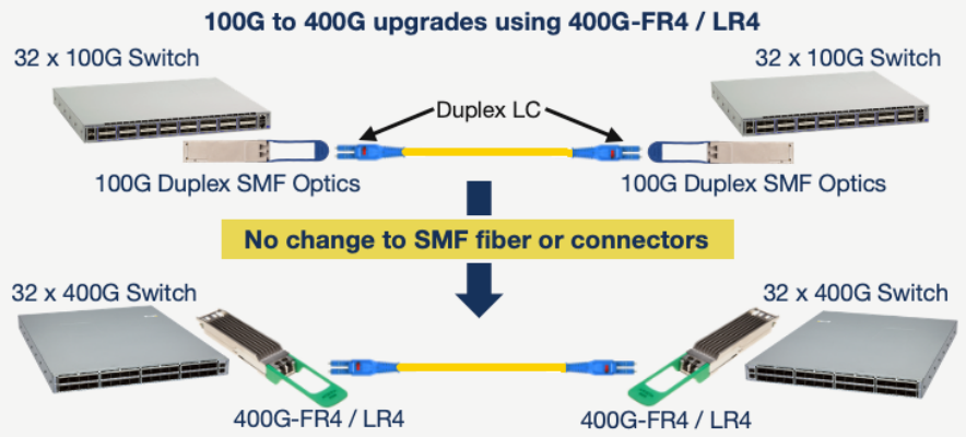 Perhaps the most significant advantage is seamless backward compatibility. 400G QSFP-DD or OSFP FR4 uses the same duplex fiber infrastructure as established 100G optical standards (e.g., 100G CWDM4, 100G LR4, 100G DR/FR/LR). This means that upgrading from 100G to 400G can be achieved without any changes to existing fiber cabling. This saves significant costs and minimizes operational disruption.